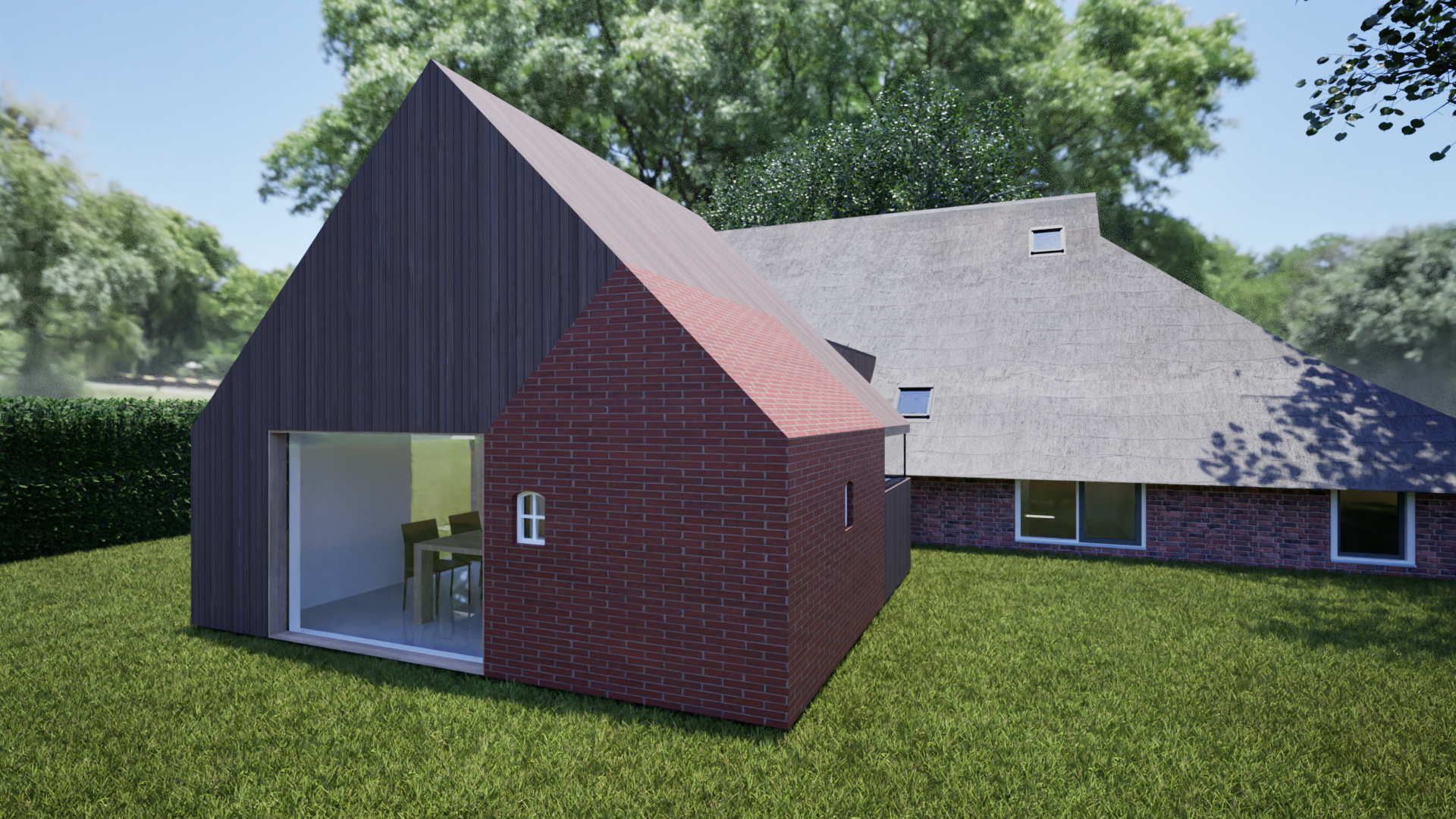 Deze keuterij in Drenthe ligt in een beschermd dorpsgezicht. Het ontwerpen van een aanbouw aan zo’n karakteristiek, rietgedekt boerderijtje was geen eenvoudige opgave. Aan de tuinzijde was de wens om de keuken te vergroten. De aanwezigheid van een eveneens karakteristiek stookhuisje maakte de opgave nog complexer. De uiteindelijke oplossing is gevonden in een eigentijdse aanbouw waar het stookhuisje visueel in is opgenomen. Het bijzondere materiaalgebruik (houten latwerk op wanden en dak en voor het stookhuisje keramische strips) maakt dat het ensemble een eenheid vormt, passend in de landelijke omgeving.