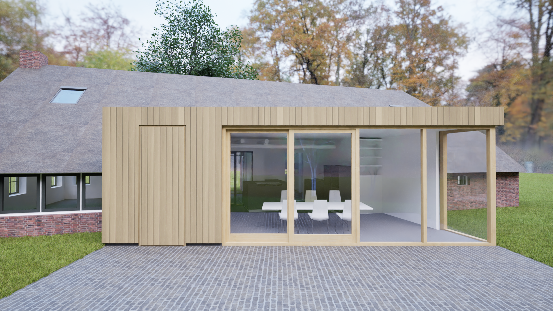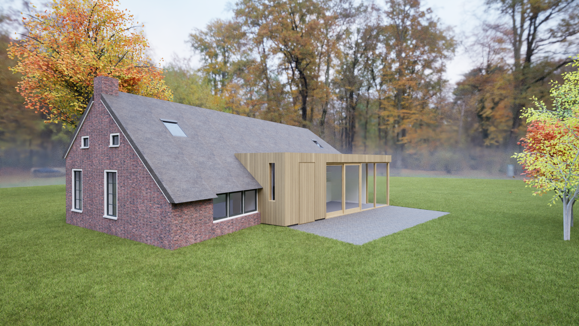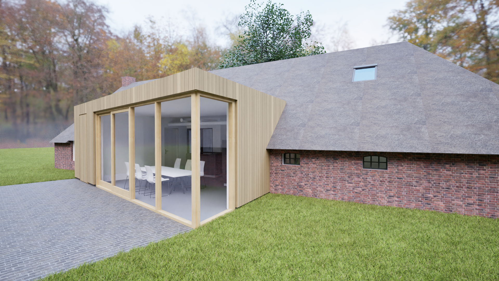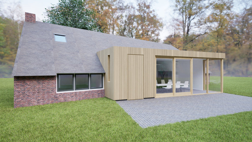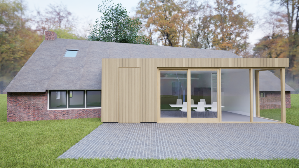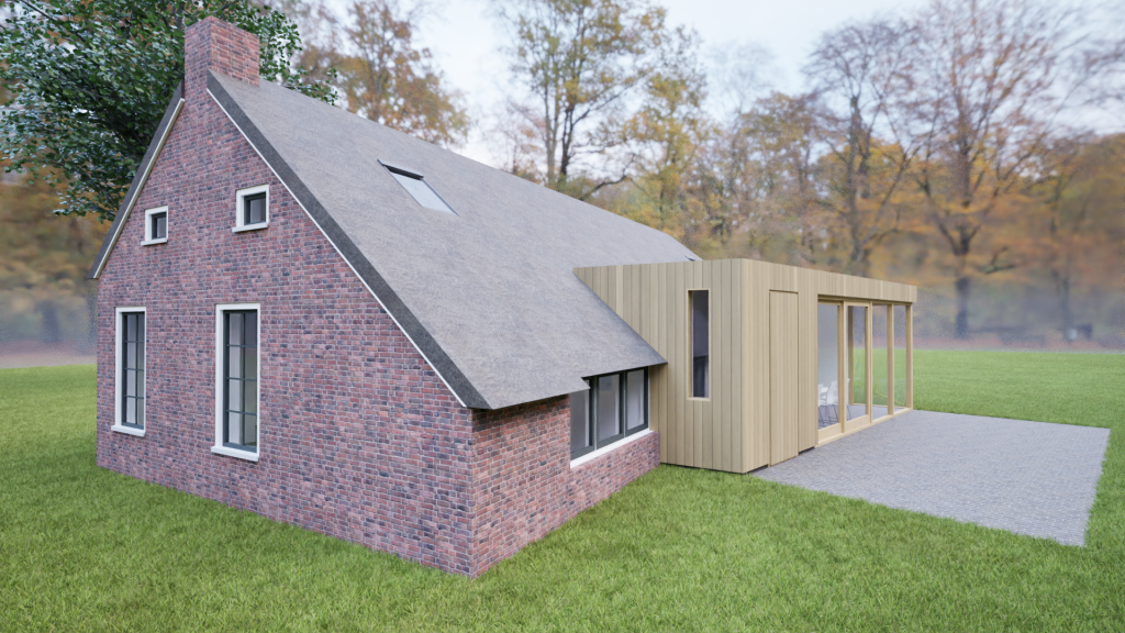 Deze voormalige keuterij in Drenthe ligt in een prachtige landelijke omgeving. Eigenaren hadden als wens meer contact met de tuin vanuit een ruimere leefkeuken. Een eenvoudige houten aanbouw vormt zich als een vleugel aan het boerderijtje en geeft via een grote glaspui zicht op de groene omgeving. We gaan starten met de uitvoering!