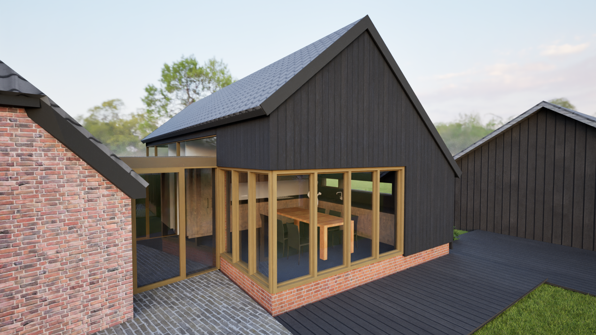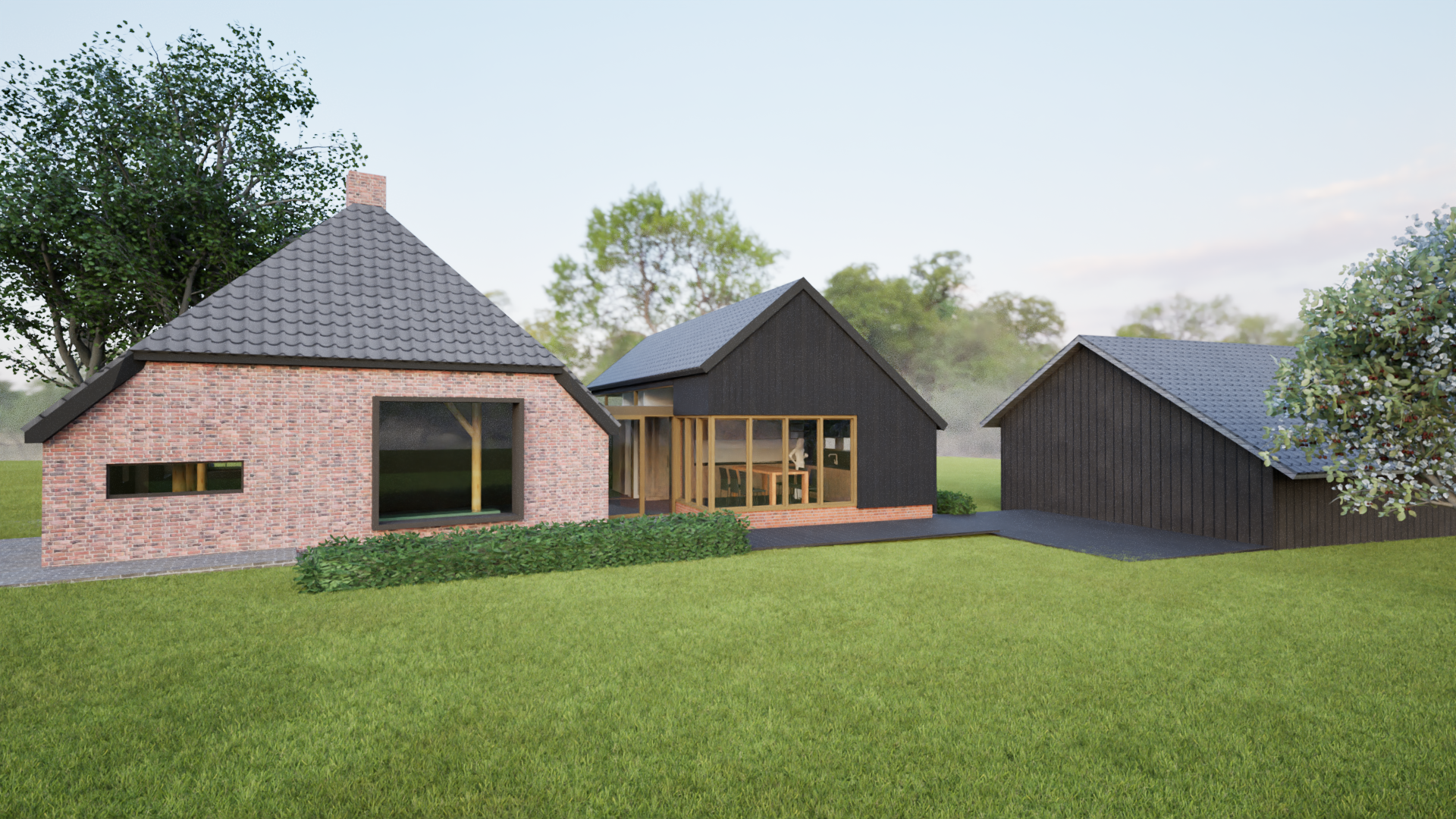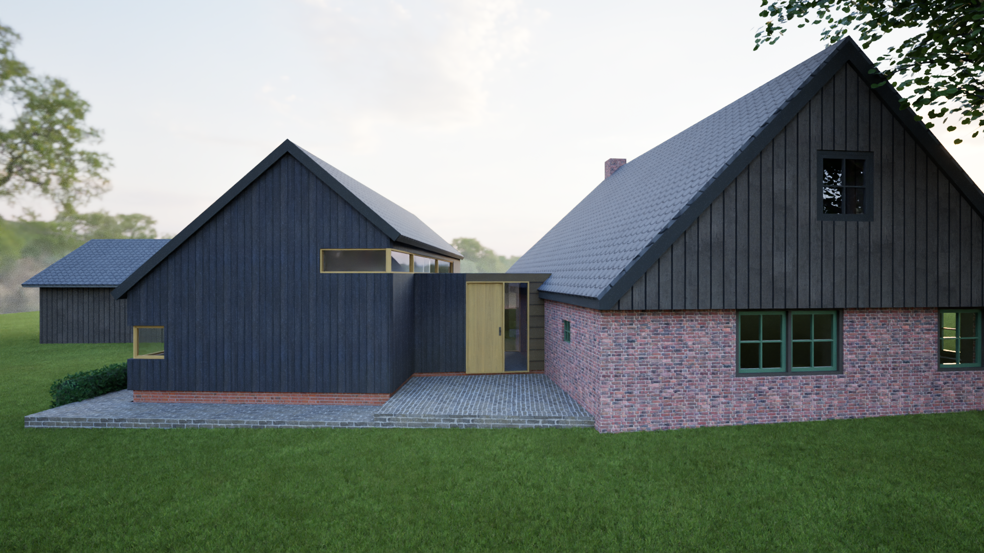Bij het realiseren van een aanbouw aan een woonhuis/boerderij is de bestaande situatie uitgangspunt en inspiratiebron voor het ontwerp. De aanbouw mag niet gaan concurreren met het hoofdgebouw. In dit geval wordt de aanbouw met een tussenlid verbonden aan het bestaande woonhuis en vormt samen met de bijgebouwde schuur een ensemble. Het cluster van gebouwtjes vormt een eenheid en gaat op in haar lommerrijke omgeving. Het materiaalgebruik is bewust aangepast aan het bestaande en heeft een landelijke uitstraling. In het interieur lopen bestaande en nieuwe ruimtes vloeiend in elkaar over. De aanbouw is ten opzichte van het hoofdgebouw onder een hoek van 10 graden gedraaid en richt zich daardoor op het prachtige en weidse coulisselandschap. Het tussenlid vormt een verbindend element in de vorm van een wig. Hier bevindt zich de entree van de woning en openbaart zich het landschap.
